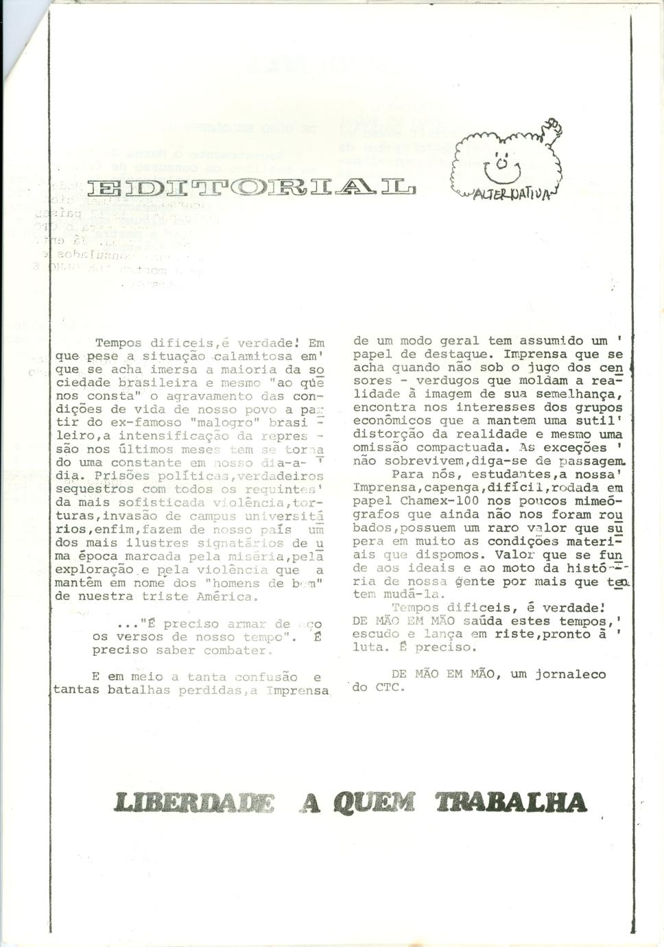 Editorial. Jornal da chapa Alternativa, do CTC, do movimento estudantil da PUC-Rio, sem número.