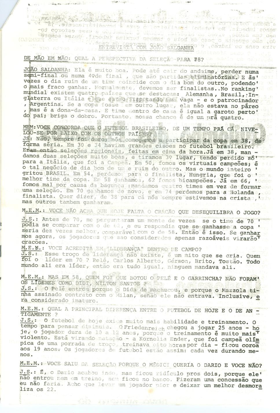 Entrevista com João Saldanha. Jornal da chapa Alternativa, do CTC, do movimento estudantil da PUC-Rio, sem número.