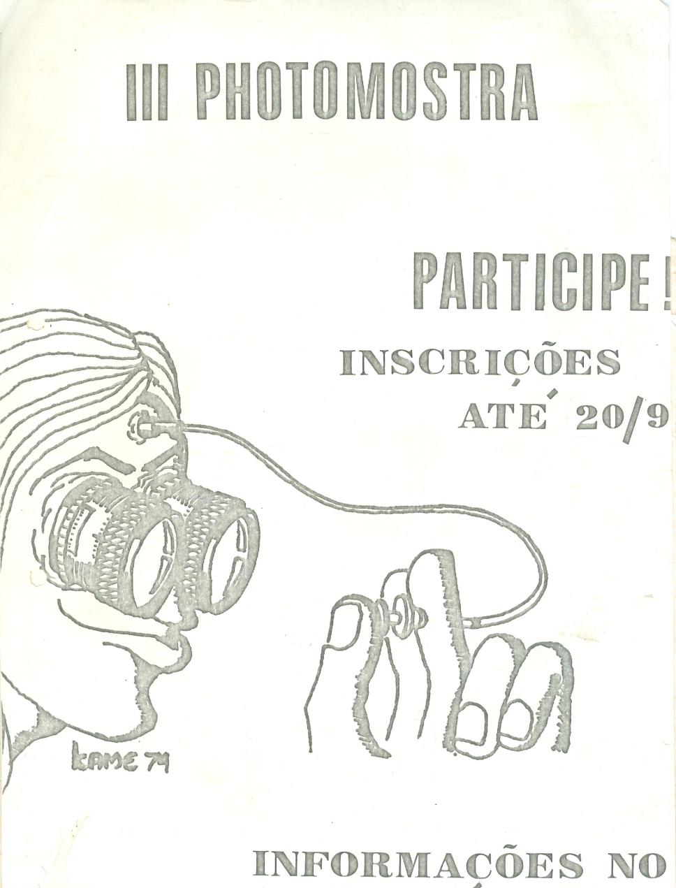 Chamada para inscrições na III Photomostra. A exposição teve 100 fotografias de 30 alunos da PUC-Rio, e foi realizada em outubro de 1975 na Biblioteca Central da Universidade.