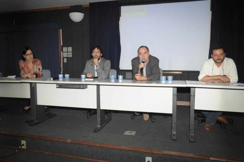 Da esq. para dir.: profa. Gisele Guimarães Cittadino (JUR), deputado Jean Wyllys, prof. Luis Roberto Azevedo Cunha (ECO), prof. Paulo Mesquita D’Ávila Filho (SOC)