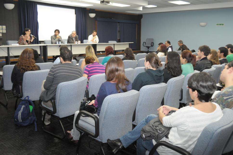Na mesa, da esq. para a dir.: profa. Gisele Guimarães Cittadino (JUR), deputado Jean Wyllys, prof. Luis Roberto Azevedo Cunha (ECO), prof. Paulo Mesquita D’Ávila Filho (SOC)