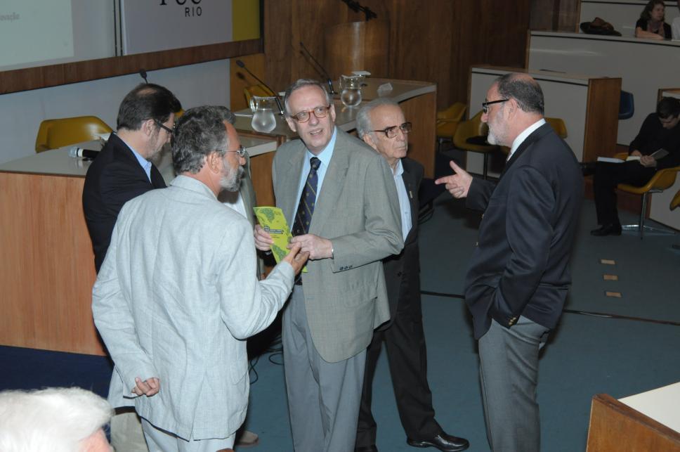 Da esq. para dir.: prof. Luiz Alencar Reis da Silva Mello (CETUC), prof. Paulo Fernando Carneiro de Andrade (TEO, decano do CTCH), prof. Danilo Marcondes de Souza Filho (FIL), prof. pe. Pedro Magalhães Guimarães Ferreira S.J. (ELE), prof. Hilton Augusto Koch (EMPG, CCBS)
