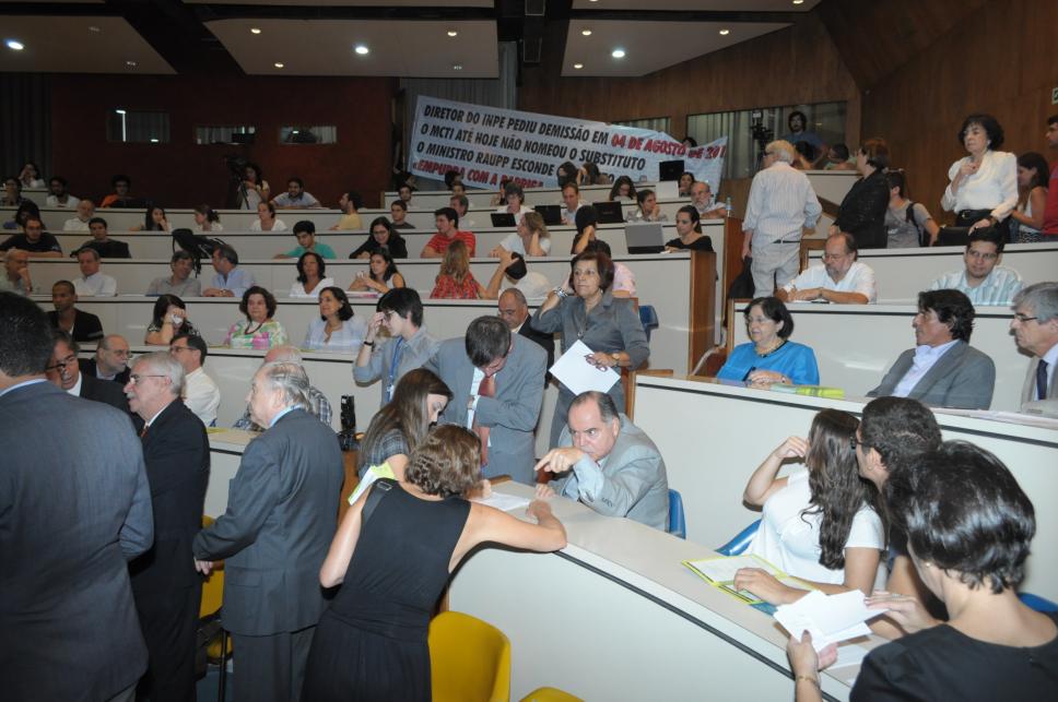 Plateia e a faixa de protesto na Aula Magna do ministro Marco Antônio Raupp.