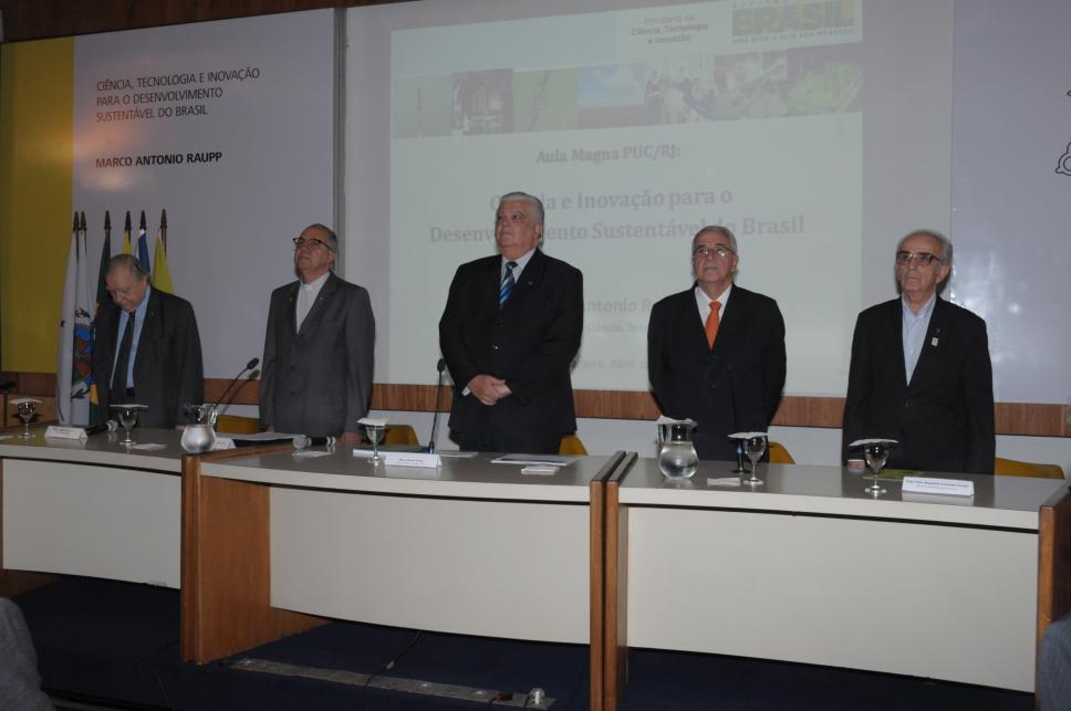 pe. Francisco Ivern Simó S.J. (Vice-Reitor), prof. pe. Josafá Carlos de Siqueira S.J. (GEO, Reitor), Marco Antônio Raupp (ministro de Estado da Ciência, Tecnologia e Inovação), Alexandre Cardoso (secretário estadual de Ciência e Tecnologia), prof. pe. Pedro Magalhães Guimarães Ferreira S.J. (ELE)