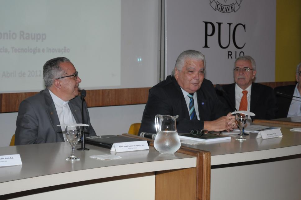 prof. pe. Josafá Carlos de Siqueira S.J. (GEO, Reitor), Marco Antônio Raupp (ministro de Estado da Ciência, Tecnologia e Inovação) e Alexandre Cardoso (secretário estadual de Ciência e Tecnologia)