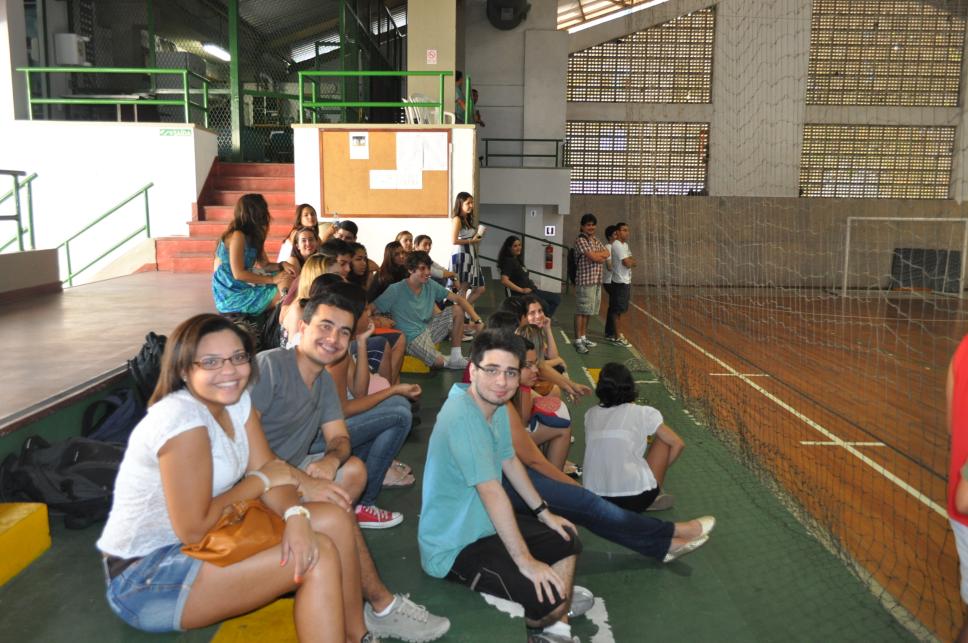 Alunos na arquibancada do ginásio assistem aos colegas jogando.