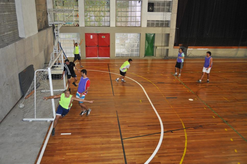 Futebol de salão na quadra do Ginásio. Momento de um gol.