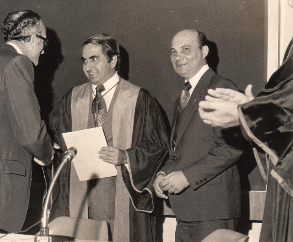 Cerimônia com o reitor Padre Mac Dowell S.J.. Não parece ser uma formatura, pode ser uma homenagem a um professor.