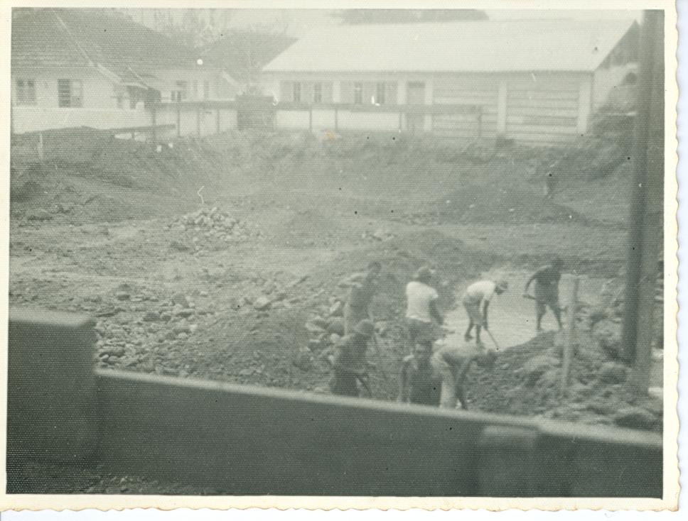 Parece ser a escavação para as fundações do prédio da Química (bloco E do Edifício Cardeal Leme) vista do final do Edifício Central (Bloco D). Vê-se o que parece ser um galpão e pelo menos duas casas (à esquerda), talvez remanescentes das vilas de casas que havia nos terrenos do campus.,