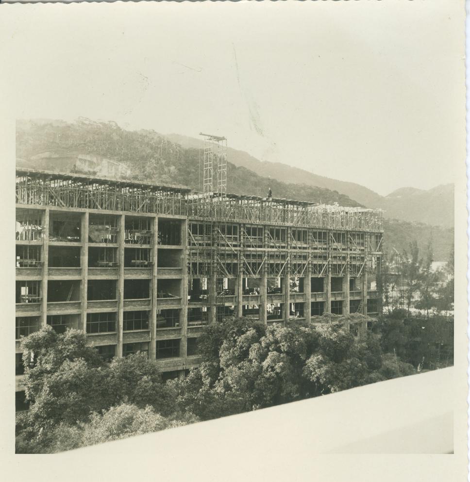 Construção do Edifício da Amizade vista de uma sacada do Edifício Cardeal Leme. Ala Kennedy com a obra bem avançada. Vê-se um jesuíta, de batina, no teto.