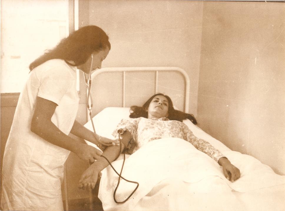 Ambulatório em local não identificado, talvez uma das casas da Vila. Moça em uma cama durante atendimento por enfermeira, que usa estetoscópio e esfigmomanômetro.