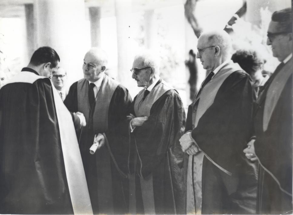 O reitor pe. Laércio entrega o diploma e a medalha Cardeal Leme ao prof. Pedro Calmon no evento comemorativo do Jubileu de Prata da PUC-Rio. Na ocasião, com a presença do Embaixador da Alemanha Ocidental, foi inaugurado o prédio da Biblioteca Central, ainda em obras, e houve o descerramento das placas aos benfeitores.