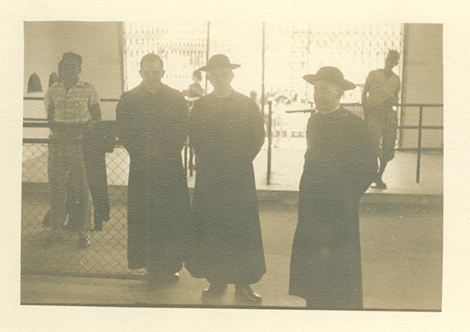 Dia do Reitor. Padres na entrada do ginásio esportivo no Colégio Santo Inácio.