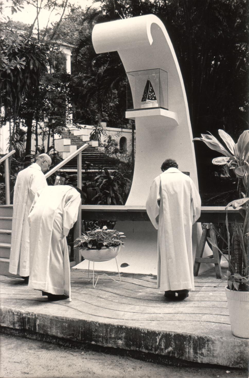 Recolocação da imagem de Nossa Senhora da Aparecida em seu nicho após restauração devido ao tombamento de uma palmeira que danificou a imagem. Ao fundo, o Solar Grandjean de MOntigny.