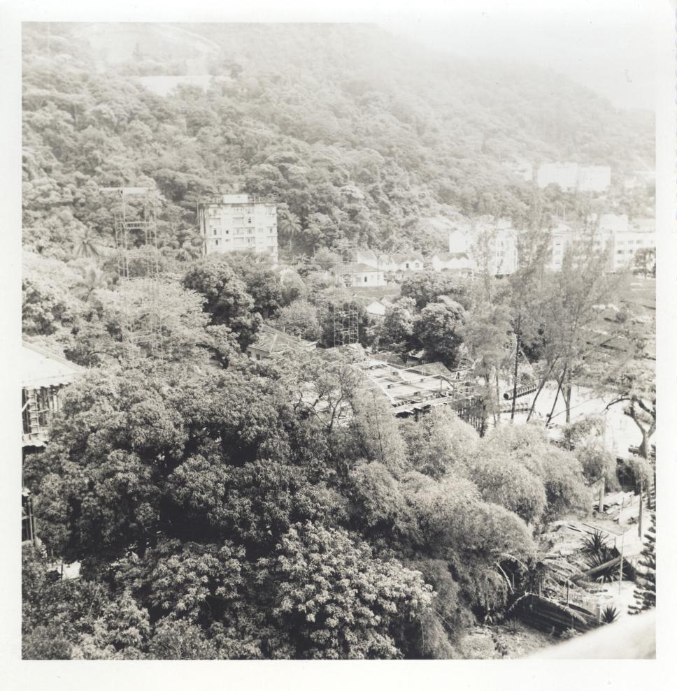 Vista a partir do ed. Cardeal Leme das obras do Edifício da Amizade. Vê-se ao fundo os prédios da Marquês de São Vicente e, à direita, o Parque Proletário da Gávea