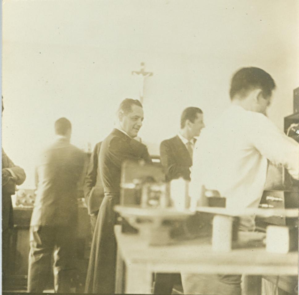 Padre Laércio em visita a laboratório de eletrônica.