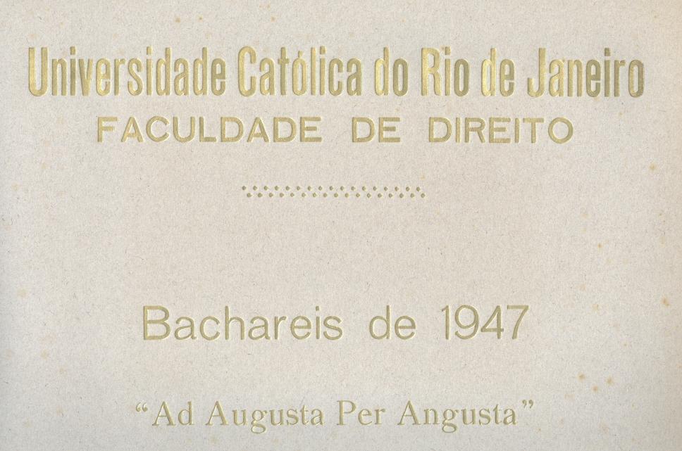Apresentação do álbum de formatura da turma da Faculdade de Direito. Ainda escrito "Universidade Católica do Rio de Janeiro", "Ad Augusta Per Augusta" e "Bachareis de 1947".