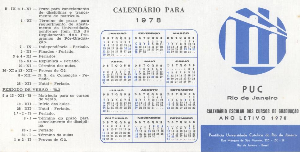 Calendário Escolar dos Cursos de Graduação PUC - Ano Letivo 1978 - frente. Rua Marquês de São Vicente, 225.