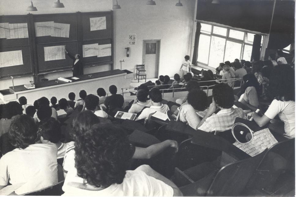 Palestra do Reitor pe. Mac Dowell S.J. sobre a solução a ser adotada para a construção da auto-estrada Lagoa-Barra. Na parede, um cartaz da chapa Mutirão, ao DCE.