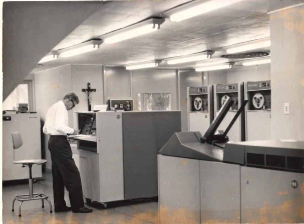 Pessoa opera um computador Burroughs. Na sala há leitoras de cartões perfurados e de fitas magnéticas