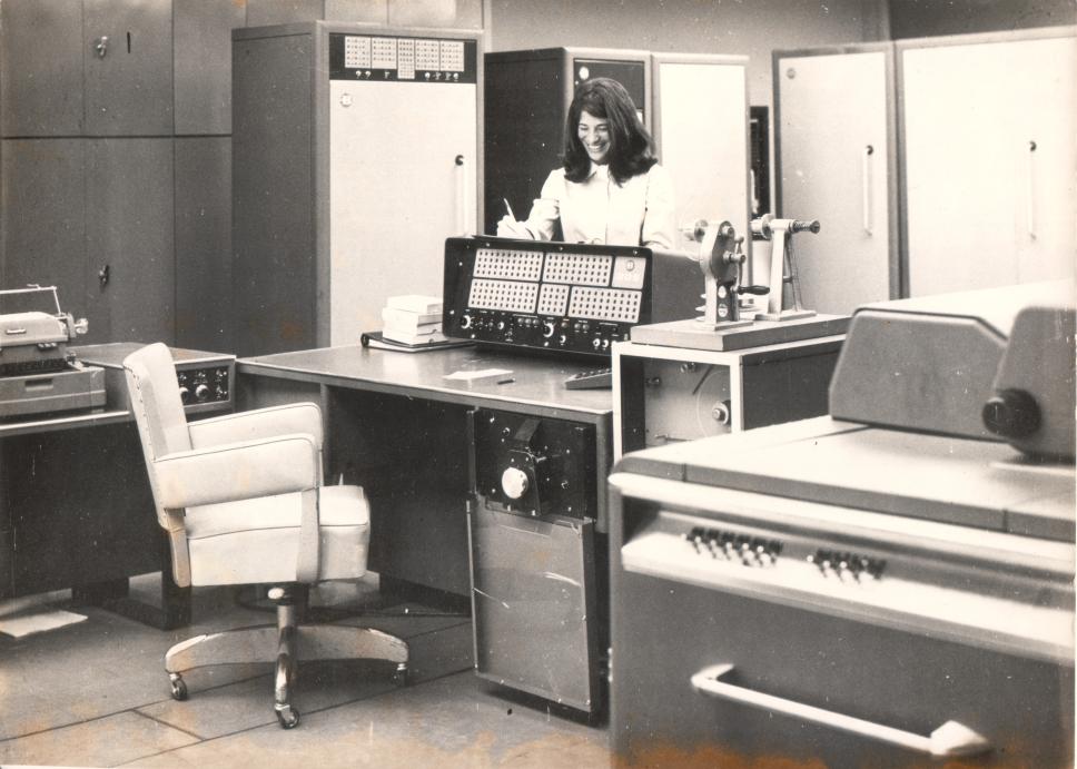 Pesquisadora na sala com o Computador Burroughs 205.