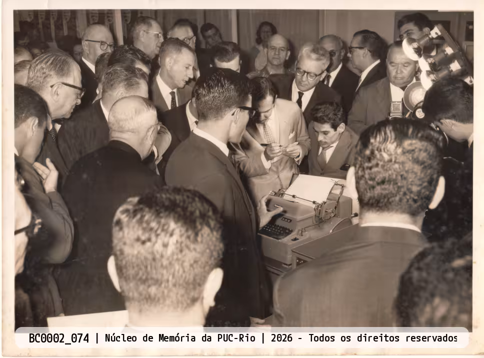 Computador Burroughs 205 cercado por pessoas que observam a máquina de escrever/impressora, no dia da inauguração do Centro de Processamento de Dados.