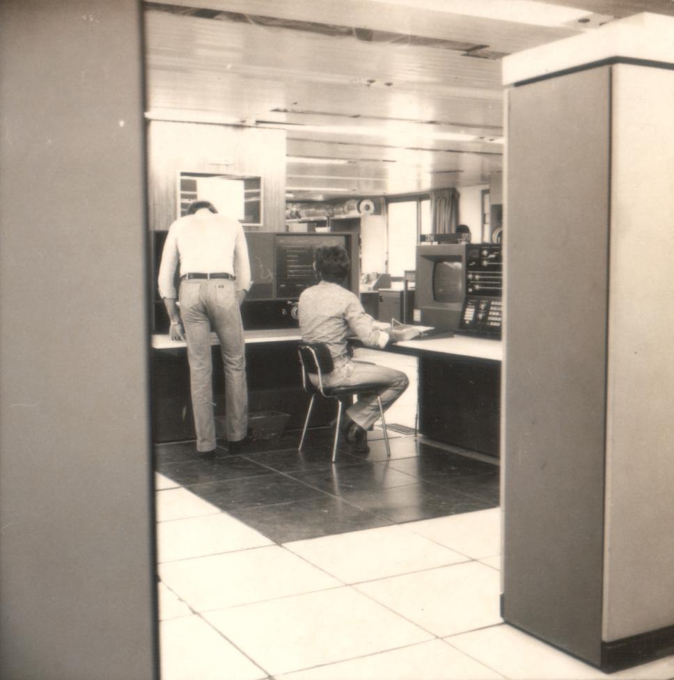 Pessoas operam o computador IBM 370.