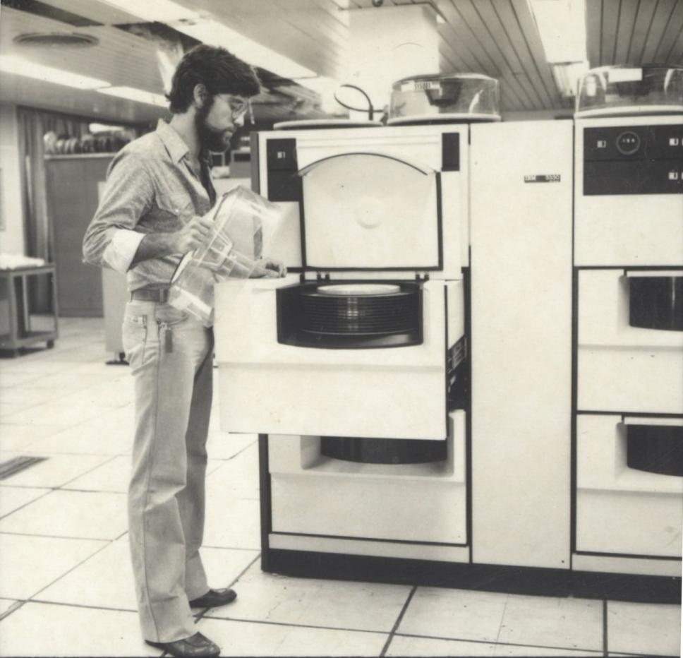Operadores do Computador IBM 370. Unidade de leitura de disco rígido (Pack Disk) IBM 3330, tipo "panelão". Segundo o site da IBM, cada unidade de disco podia armazenar até 200 Mb.