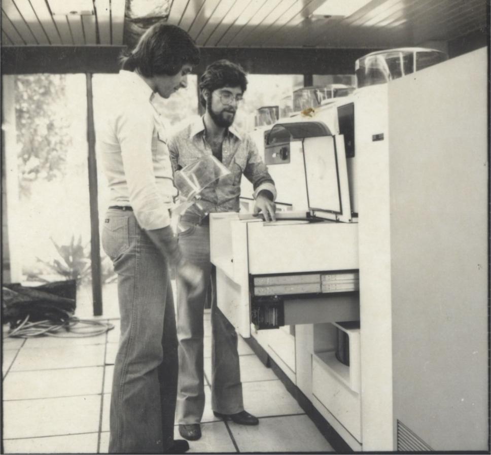 Operadores do Computador IBM 370. Unidade de leitura de disco rígido (Pack Disk) IBM 3330, tipo "panelão". Segundo o site da IBM, cada unidade de disco podia armazenar até 200 Mb.