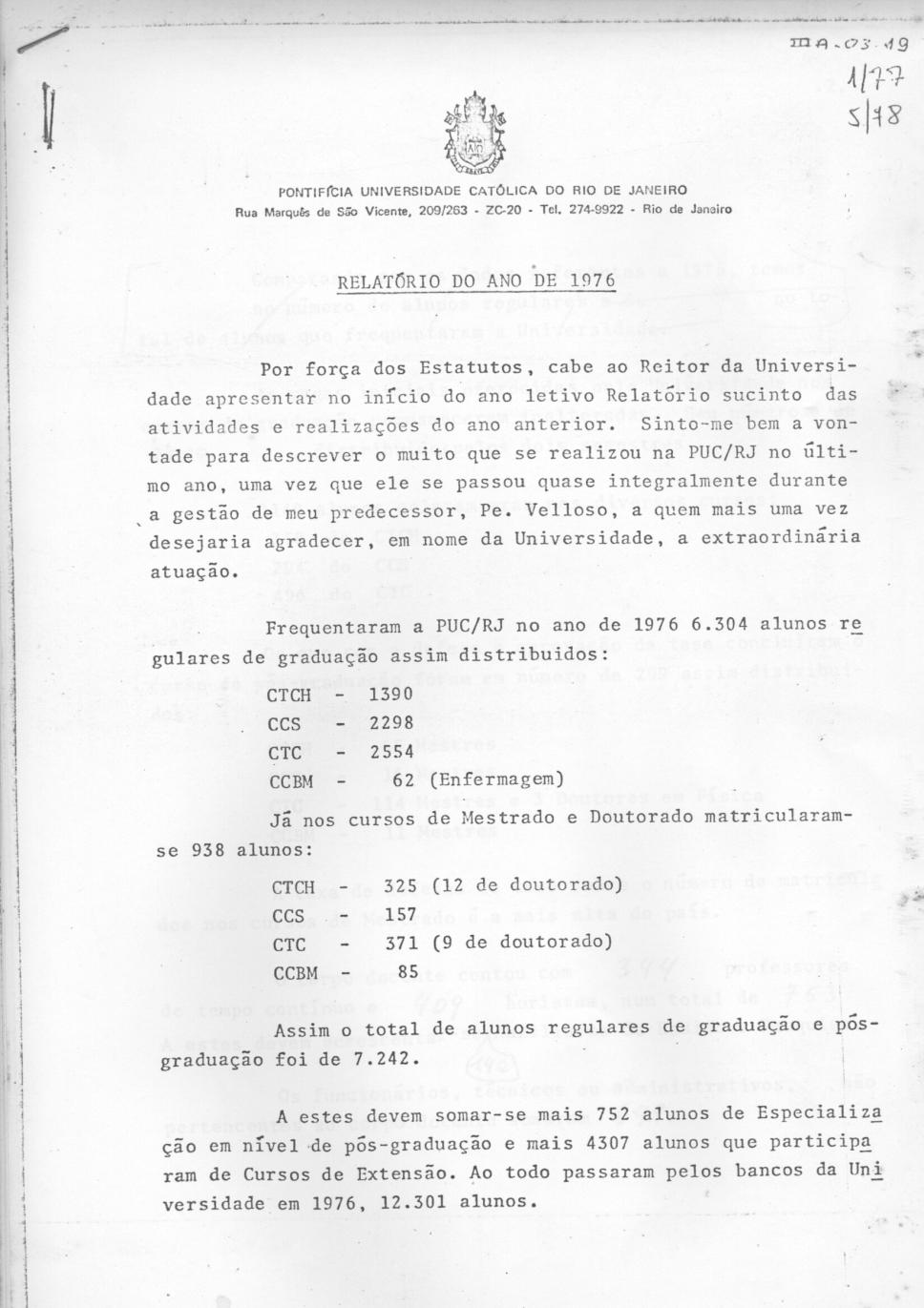Relatório do Reitor da PUC-Rio de 1976, p.1. Totais de alunos matriculados, graduação, pós-graduação, especialização e extensão.