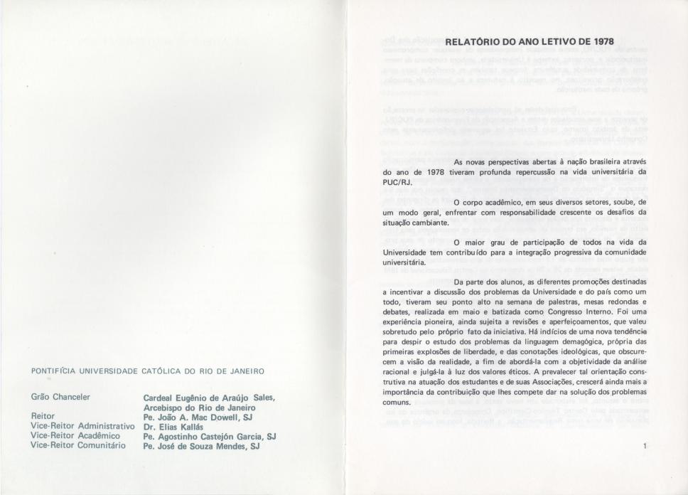 O Relatório apresenta o balanço das atividades acadêmicas da PUC-Rio do ano de 1978. A publicação contém informações do corpo docente e discente, da Associação dos Docentes (ADPUC) e da Associação de Funcionários (AFPUC), do projeto de reformulação da Regulamentação da Carreira Docente e dos convênios estabelecidos com a FUNARTE, FINEP, BNDE, MEC, IPHAN, entre outros. Destaca os projetos, os eventos, as palestras e os seminários realizados em 1978 e traz também dados sobre a situação financeira da Universidade e das bolsas de estudos. O Relatório foi apresentado pelo reitor pe. João Mac Dowell S.J. na abertura do ano acadêmico em 09 de março de 1979.