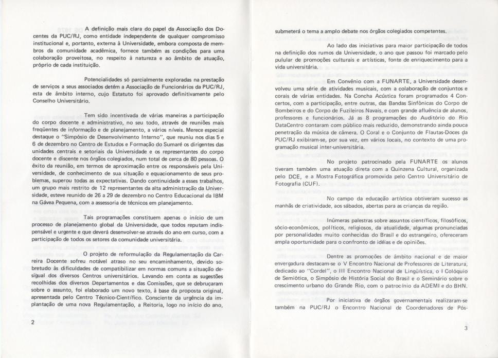O Relatório apresenta o balanço das atividades acadêmicas da PUC-Rio do ano de 1978. A publicação contém informações do corpo docente e discente, da Associação dos Docentes (ADPUC) e da Associação de Funcionários (AFPUC), do projeto de reformulação da Regulamentação da Carreira Docente e dos convênios estabelecidos com a FUNARTE, FINEP, BNDE, MEC, IPHAN, entre outros. Destaca os projetos, os eventos, as palestras e os seminários realizados em 1978 e traz também dados sobre a situação financeira da Universidade e das bolsas de estudos. O Relatório foi apresentado pelo reitor pe. João Mac Dowell S.J. na abertura do ano acadêmico em 09 de março de 1979.
