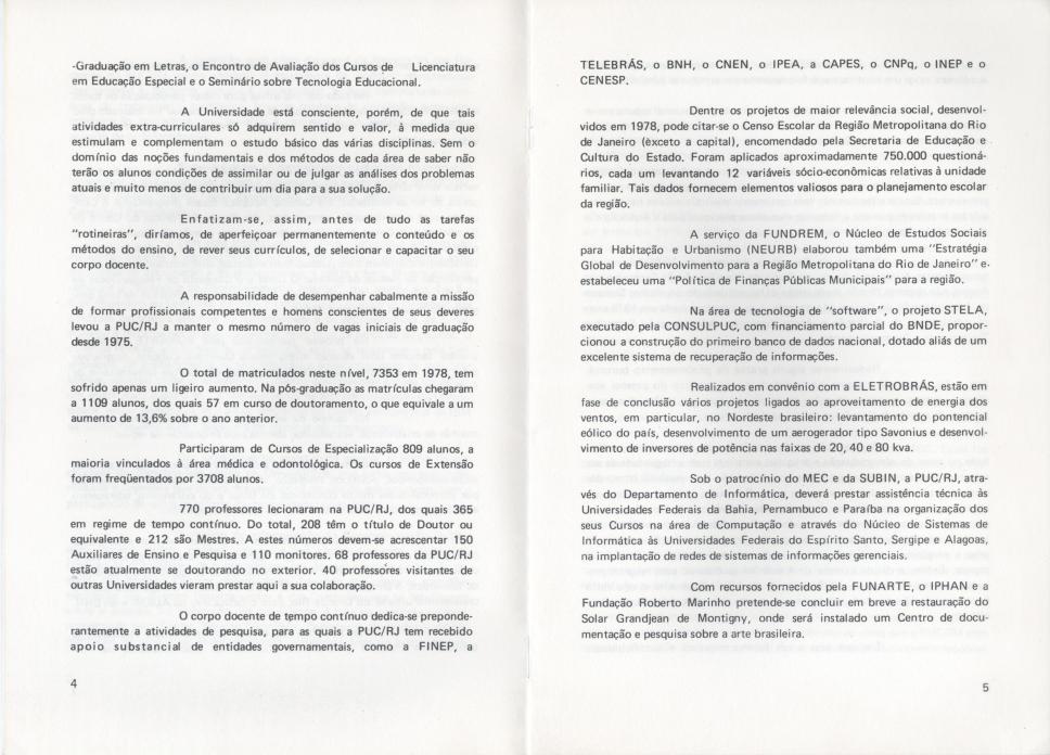 O Relatório apresenta o balanço das atividades acadêmicas da PUC-Rio do ano de 1978. A publicação contém informações do corpo docente e discente, da Associação dos Docentes (ADPUC) e da Associação de Funcionários (AFPUC), do projeto de reformulação da Regulamentação da Carreira Docente e dos convênios estabelecidos com a FUNARTE, FINEP, BNDE, MEC, IPHAN, entre outros. Destaca os projetos, os eventos, as palestras e os seminários realizados em 1978 e traz também dados sobre a situação financeira da Universidade e das bolsas de estudos. O Relatório foi apresentado pelo reitor pe. João Mac Dowell S.J. na abertura do ano acadêmico em 09 de março de 1979.
