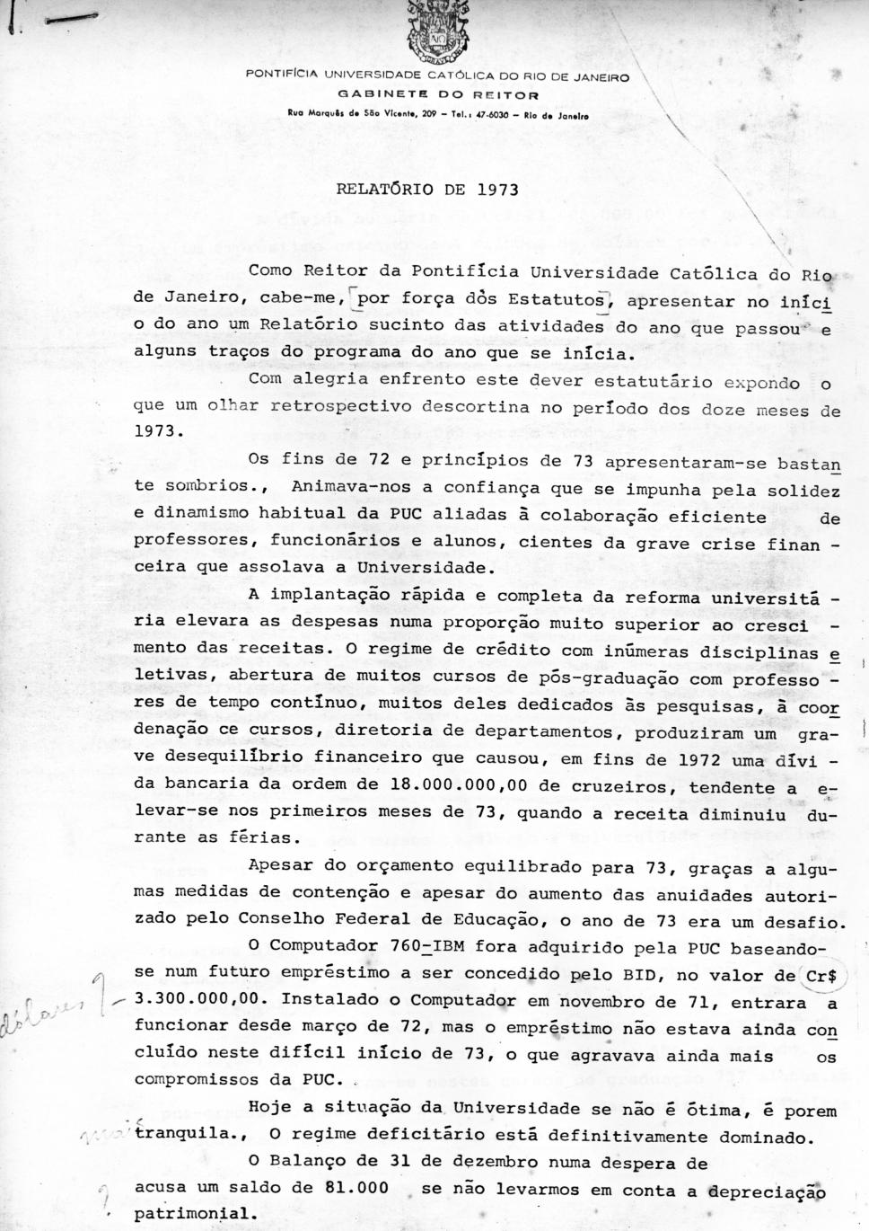 Coleção Acervo do Prof. Paulo Novaes - Vice-reitoria de Desenvolvimento - parte 8 Código exclusivo bc0003_049 Data da criação Ano 1973 Data de criação Seg, 01/01/1973 - 12:00 Referente a Reitoria Identificação Original s.i. Descrição Relatório de 1973