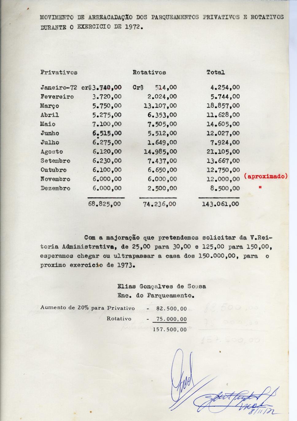 Movimento da arrecadação dos parqueamentos privativos e rotativos durante o exercício de 1972