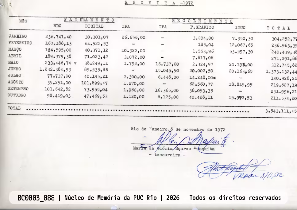Receitas da Universidade entre janeiro e outubro de 1972.