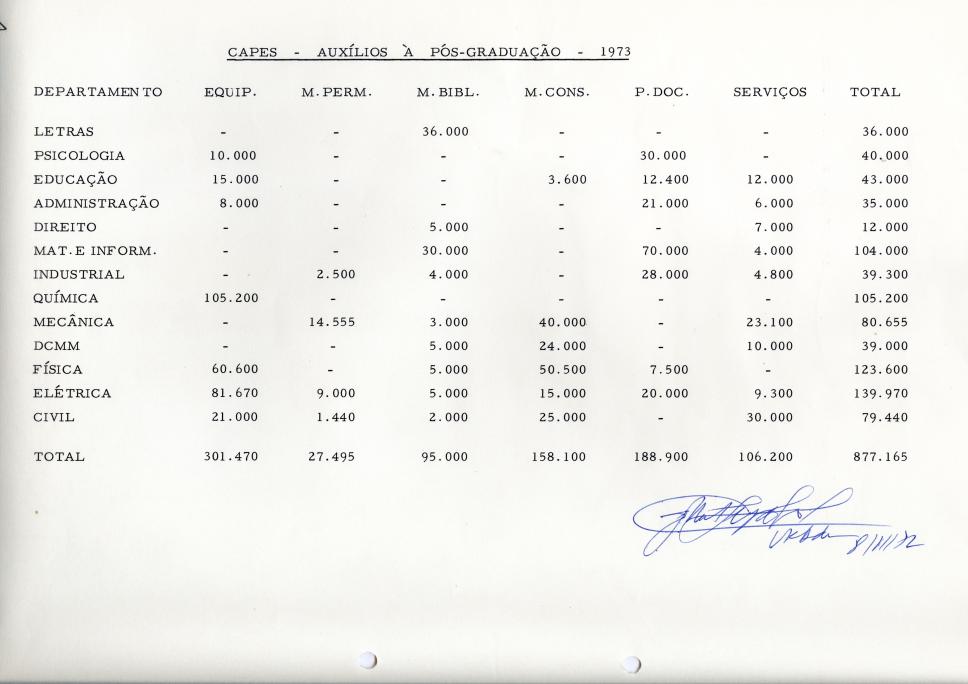 Planilha com os valores previstos de Auxílio à Pós-Graduação para 1973 pela CAPES. Departamentos de Letras, Psicologia, Educação, Administração, Direito, Matemática e Informática (juntos), Engenharia Industrial, Química, Engenharia Mecânica, Ciência dos Materiais e Metalurgia, Física, Engenharia Elétrica e Engenharia Civil.