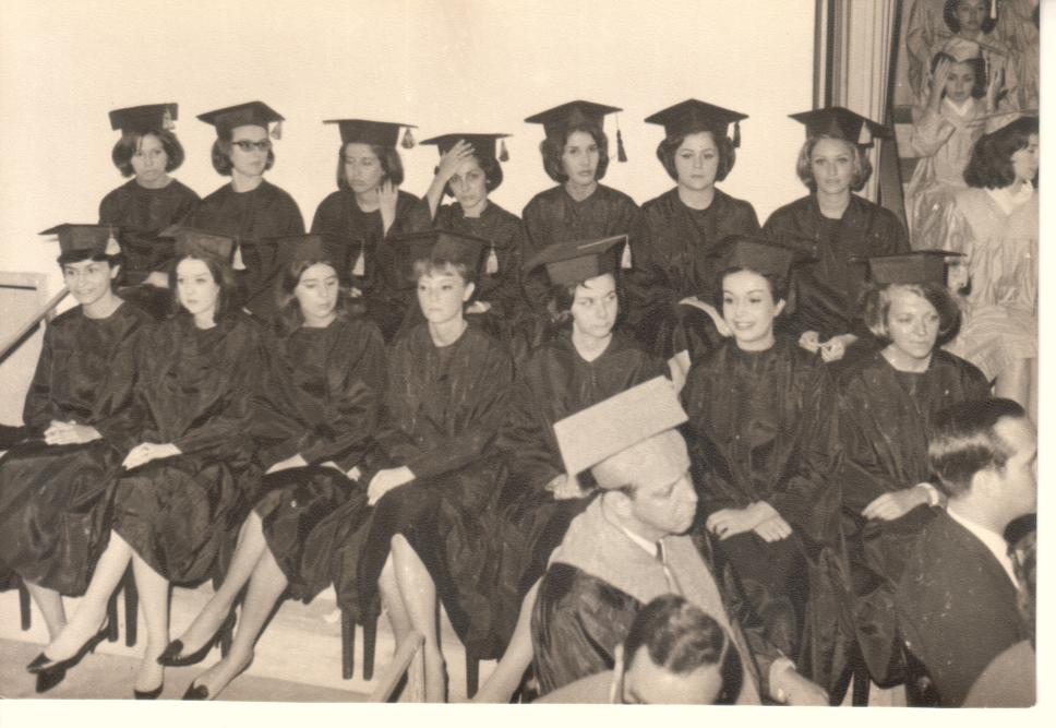 Formatura, alunas formandas, algumas com becas escuras, outras, claras.
