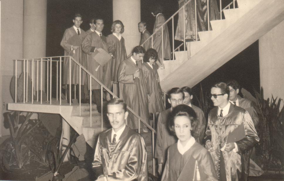 Formandos com becas descem as escadas do Ed. Cardeal Leme, aparentemente no bloco B.
