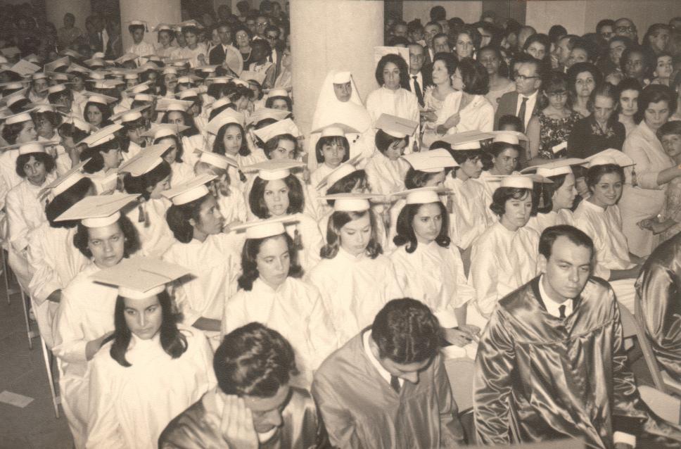 Formatura nos pilotis do Ed. Cardeal Leme. Formandos sentados, convidados ao lado.
