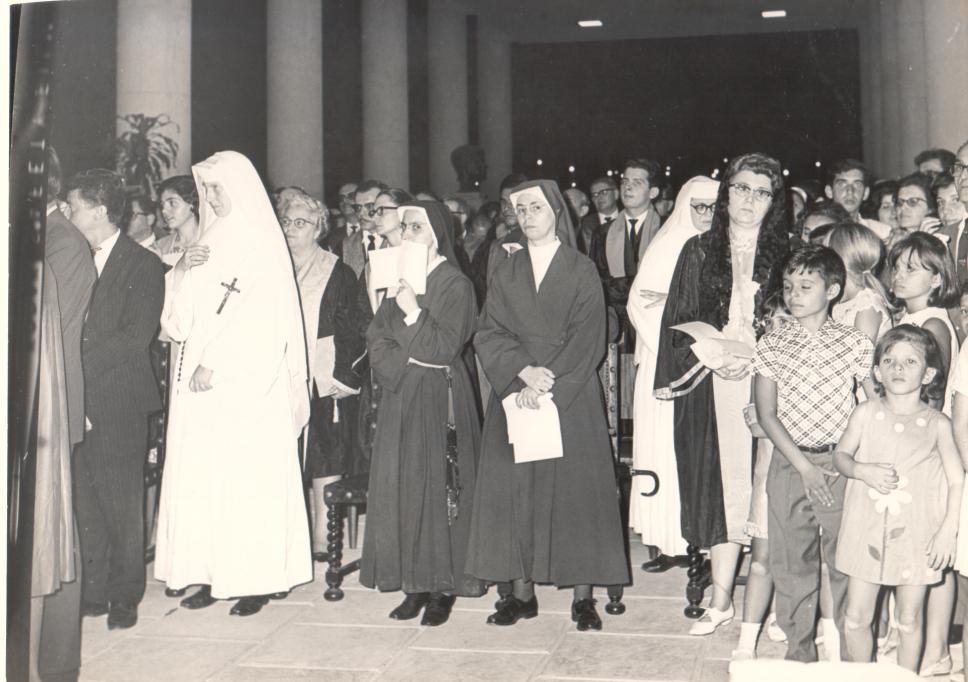 Formatura, familiares, amigos e freiras observam a cerimômnia.