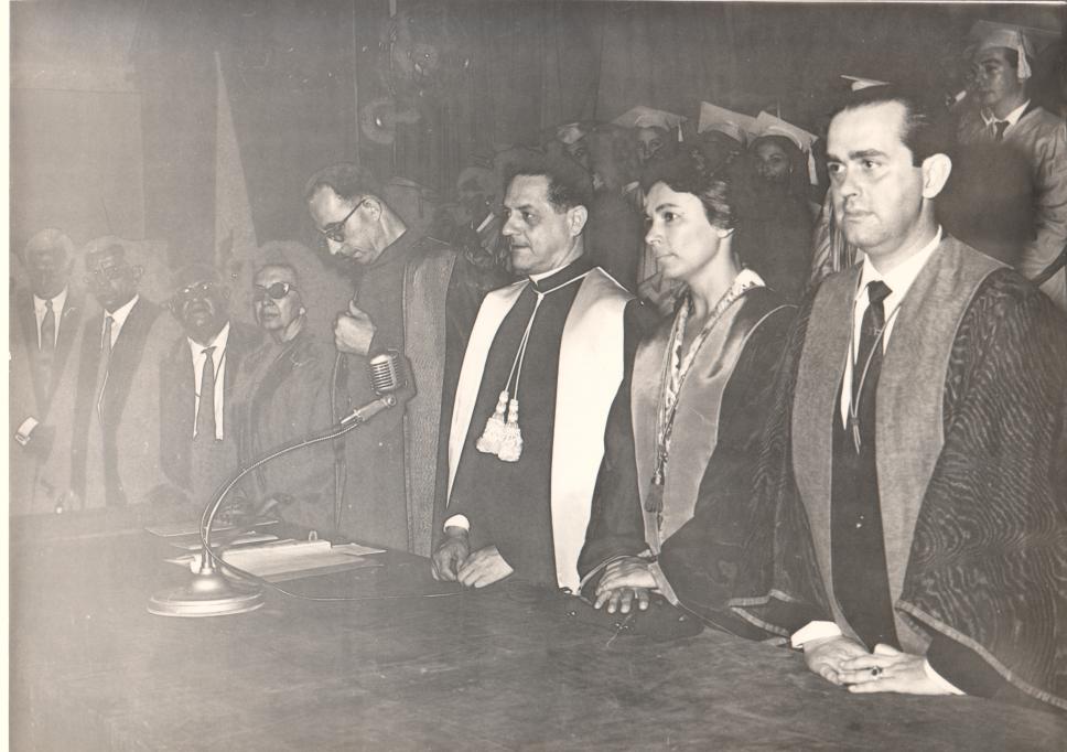 Cerimônia de formatura, mesa com autoridades e formandos ao fundo.