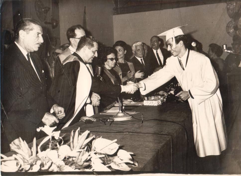 Cerimônia de formatura. Reitor cumprimenta formando.
