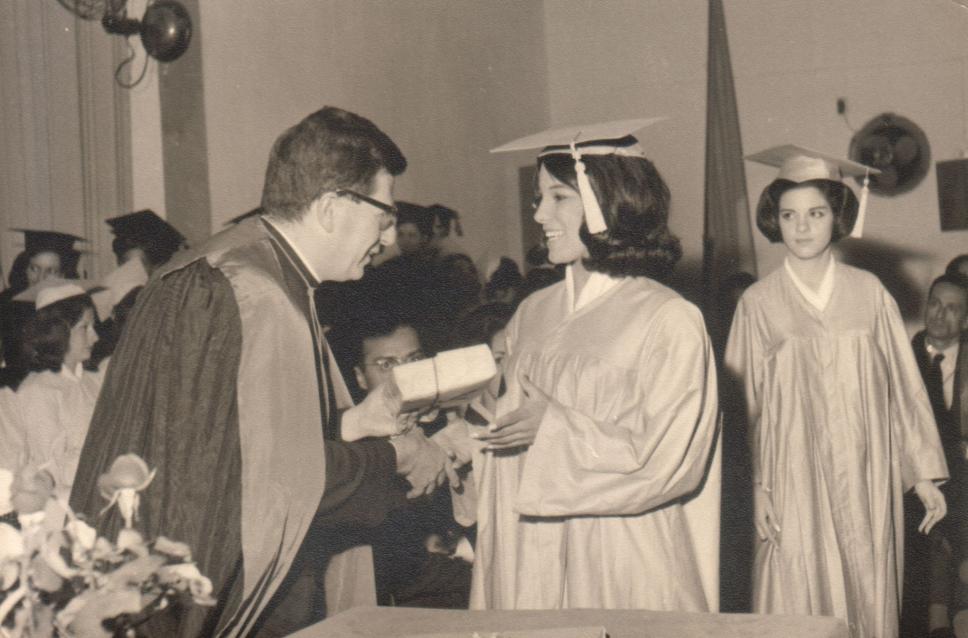 Aluna recebe um presente do Pe. Leme Lopes S.J. na sua cerimônia de formatura.