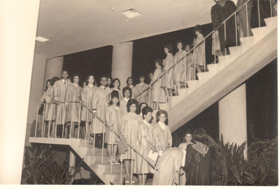 Formandos posam para fotos antes da formatura, numa das escadas do Ed. Leme.