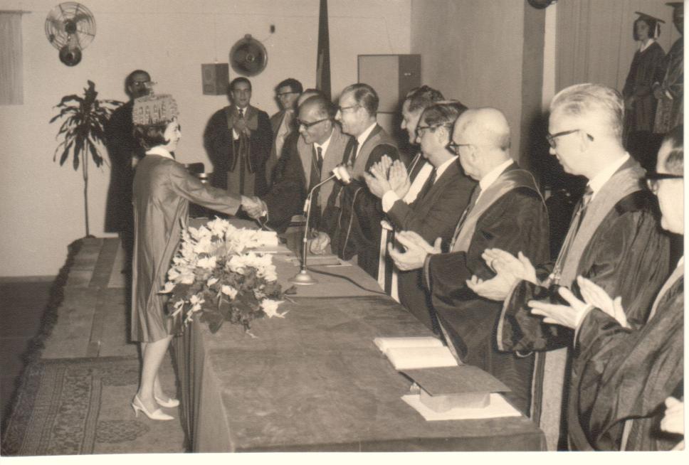 Aluna formanda é cumprimentada pelos membros da mesa em formatura.