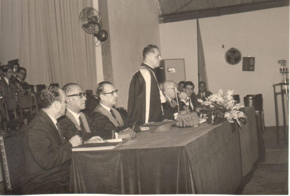 Mesa com autoridades em cerimônia de formatura. O Reitor Pe. Laércio S.J. discursa.