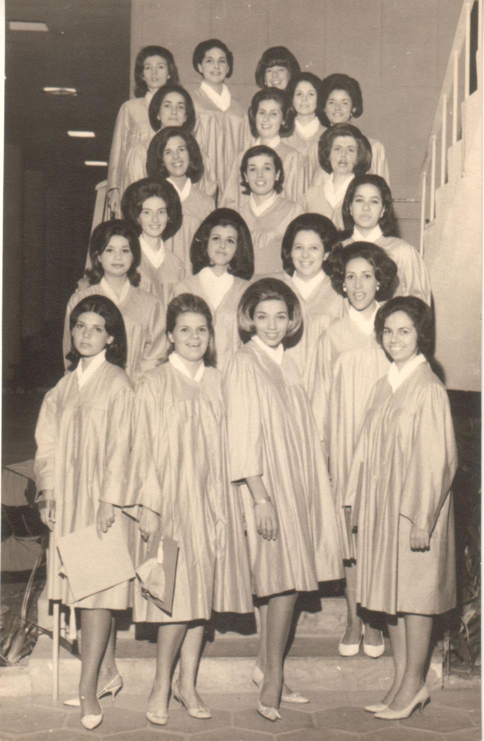 Alunas formandas posam antes da formatura para foto na numa das escadas do Edifício Cardeal Leme.