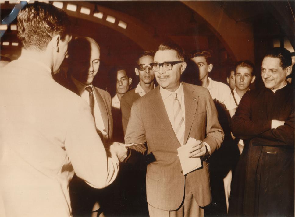 Aparentemente, o reitor Pe. Laércio S.J. recebe uma doação de uma empresa para um dos laboratórios do ITUC.