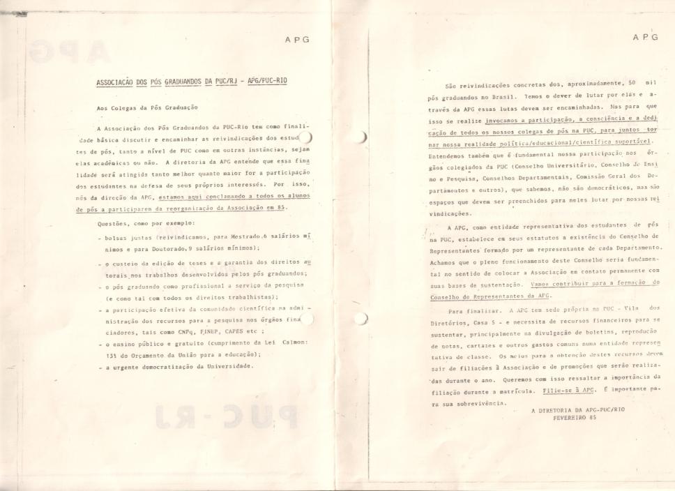 Apresentação da boneca (projeto) do Boletim da APG - Associação dos Pós-graduandos da PUC/RJ (sic) - APG/PUC-RIO (sic). Conclamação para a reorganização da APG em 1985. Demandas gerais do movimento estudantil. Haveria em torno de 50 mil pós-graduandos no Brasil.
